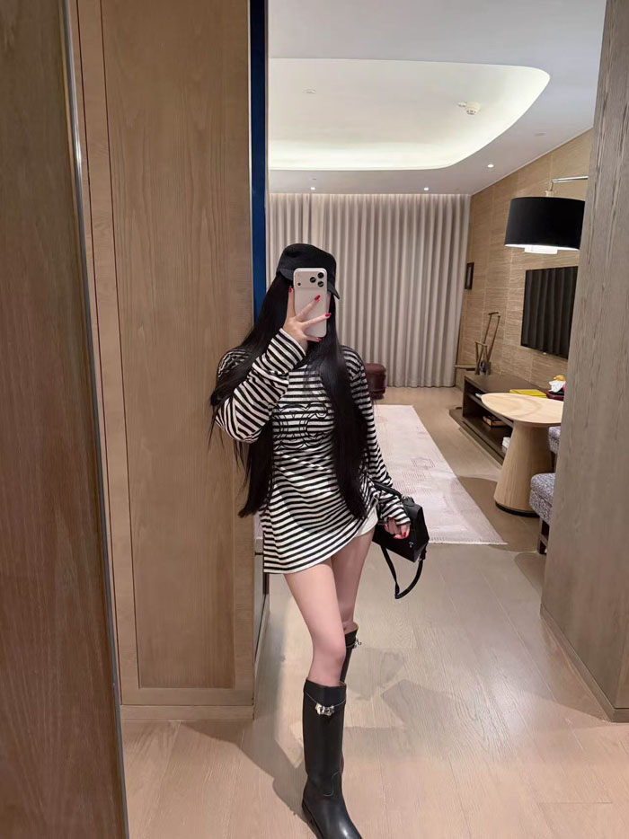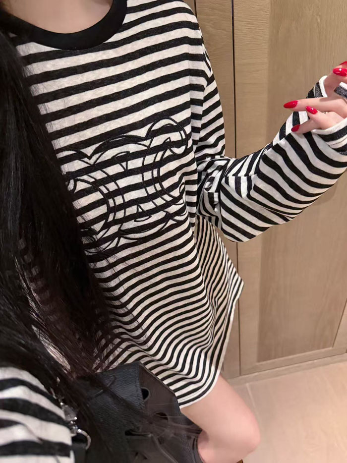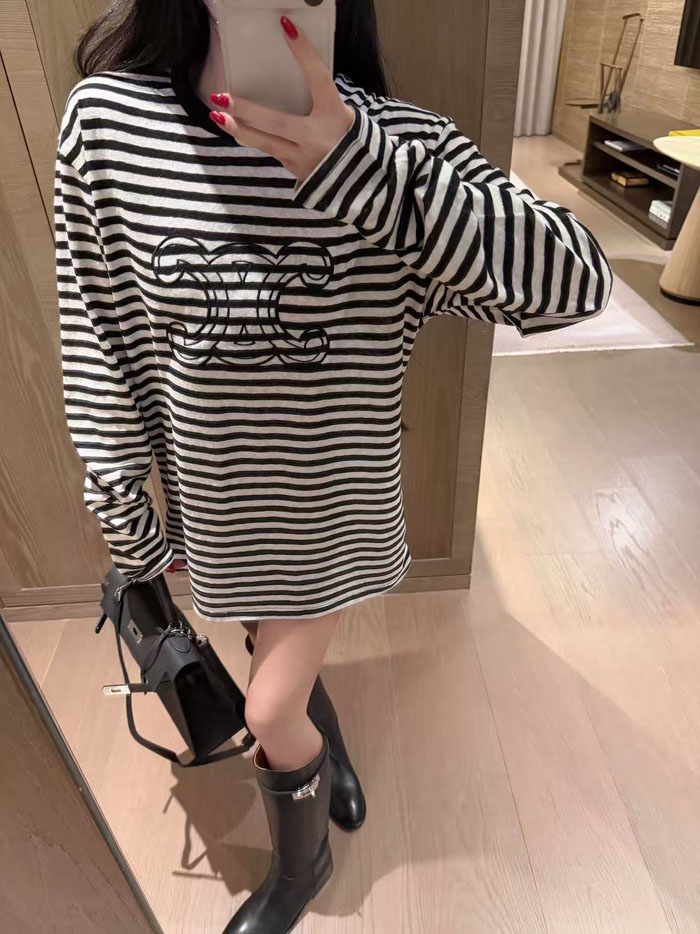 人気定番 セリーヌ風 ストライプ トリオンフ刺繍 長袖 T シャツ ユニセックス