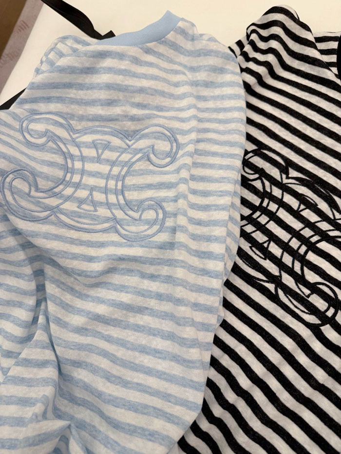・胸元中央に同系色の立体刺繍でトリオンフ凱旋門ダブル C ロゴを配置、繊細なラインでストライプと融合した低調高級感のあるデザイン