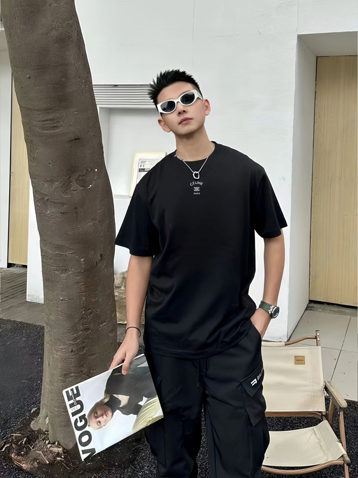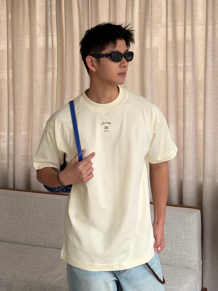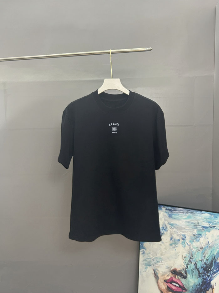 ・胸元中央に同系色のミニ刺繍を配置、アーチ状「CELINE」レター + トリオンフ凱旋門ダブル C ロゴ + 下部「PARIS」小文字の 3 段構成、細密な刺繍でシンプルながらブランド認知度を演出