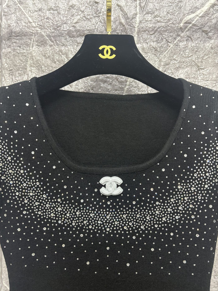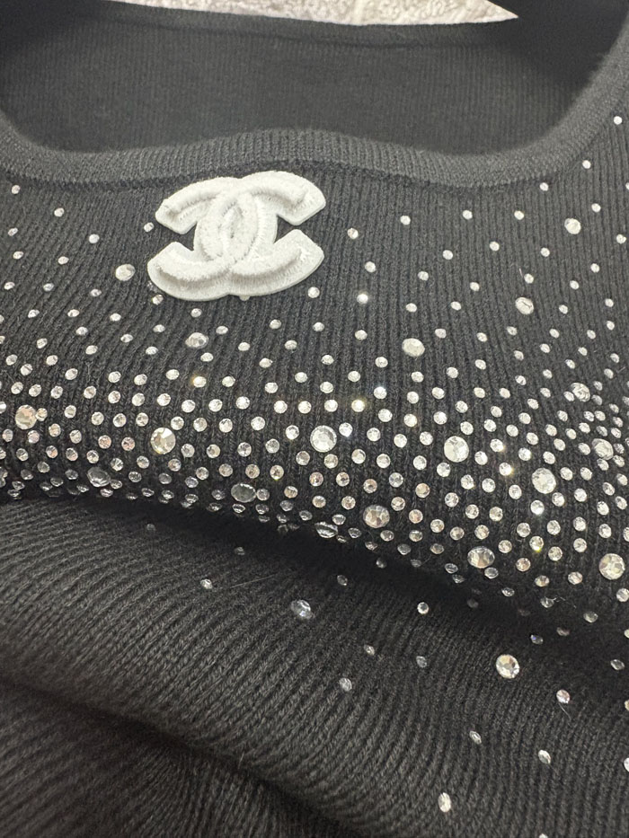 胸元から肩にかけてビジューをデザイン。光を反射する繊細な輝きが、シンプルなニット生地に華やぎと高級感を演出し、