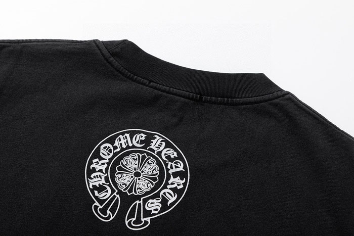 後ろ襟下にはクロムハーツのトレードマークであるホースシュークロス + ブランドレターが囲む定番プリントを、裾部分にもブランドの花体レターロゴを配置。前後でデザインを呼応させ、ブランドの世界観を隅々まで強調しています。
