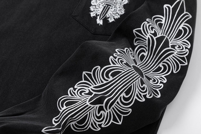 左胸にはカジュアル感と実用性を兼ね備えたフラップポケットを配置。ポケット部分にはホワイトで仕上げたクロムハーツ定番のダガー + トーテムのコンビプリントを施し、さりげなくブランドの高い認知度と高級感を演出します。