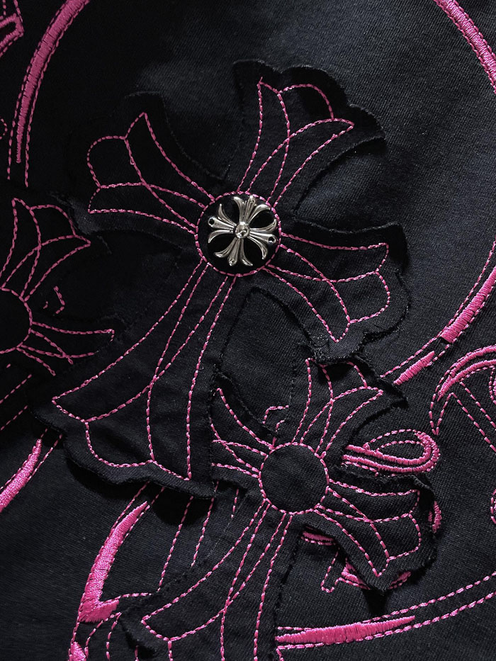 ・背面にはビッグサイズのピンクホースシュー梵字クロスの手刺繍を大胆に施し、下部にもブランドロゴ刺繍を追加し、おしゃれで個性的なカジュアルスタイルを表現