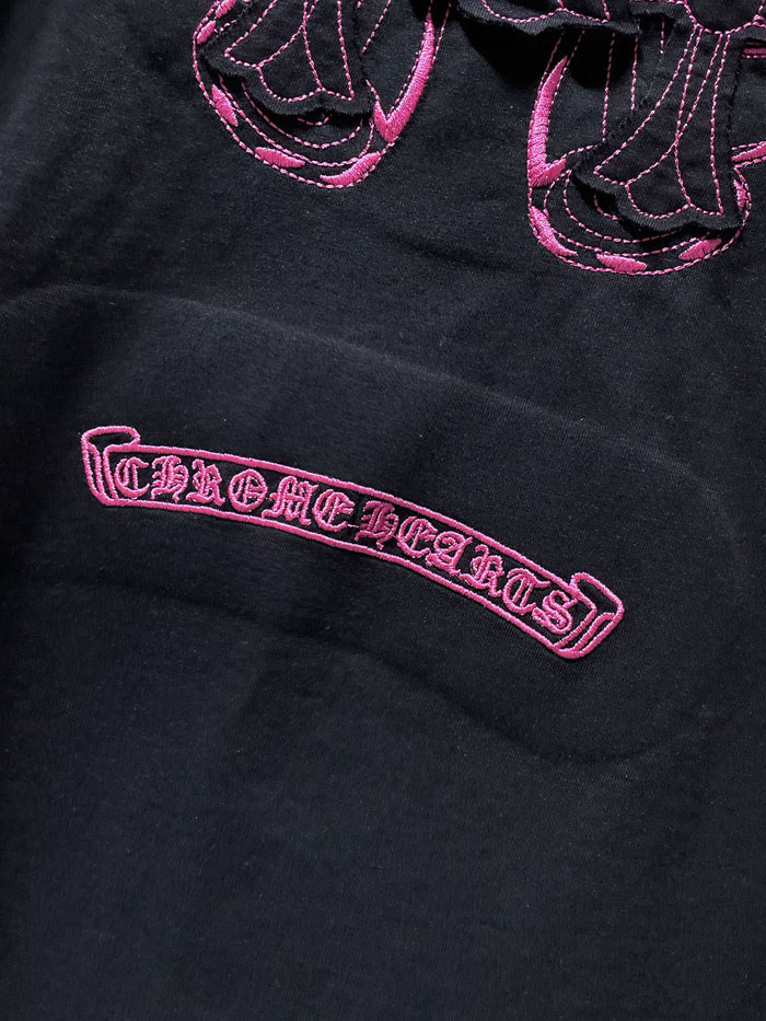 ・胸元にピンクのホースシュー梵字クロスロゴの繊細な手刺繍を配置し、細部までこだわった高級感のある仕上がりを実現