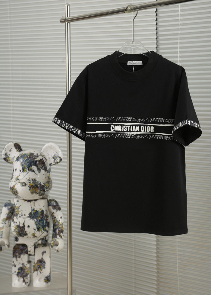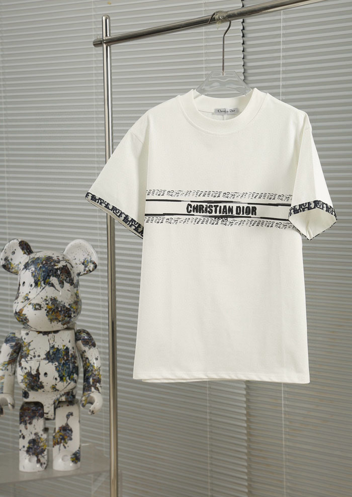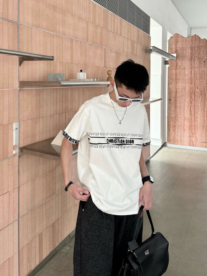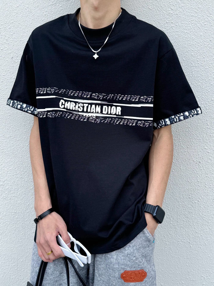 ・胸元中央に横型装飾バンドを配置、中央に「CHRISTIAN DIOR」大文字ロゴ、上下にオブリーク総柄を配し、袖口も同柄で縁取り、高いブランド認知度を実現
