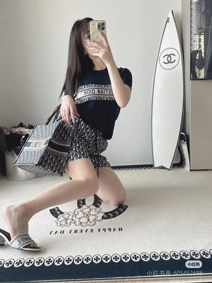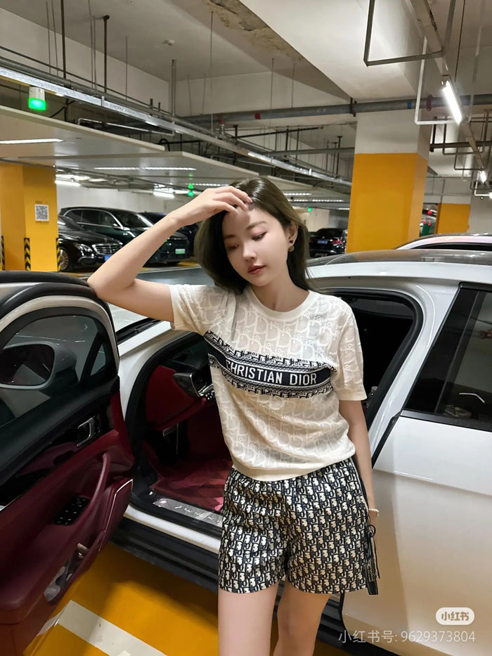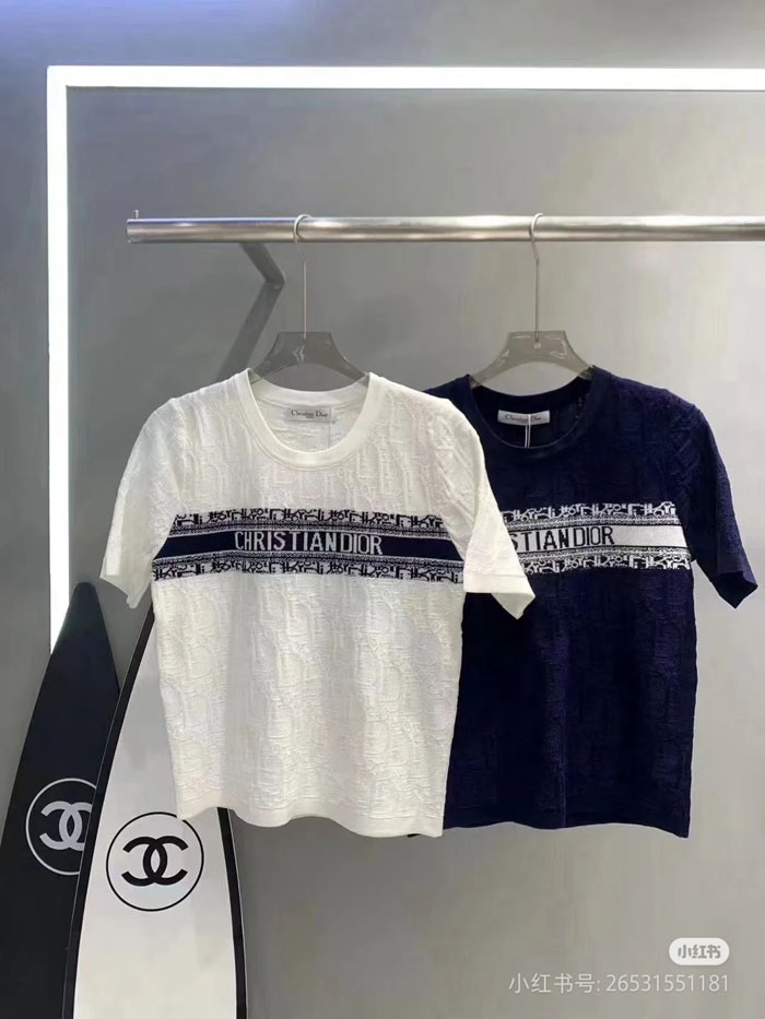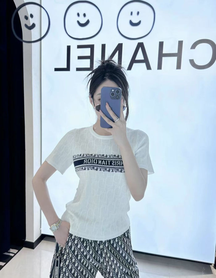 クラシックなクルーネック正肩の半袖ニット T シャツのシルエットを採用。ジャカードニット生地を使用し、衣身全体にディオール・オブリークの老花の暗紋を織り込み、自然な質感とドレープ感を備え、薄く通気性に優れ、肌触りが柔らかく蒸れにくい着心地を実現しています。「ネイビー / ブラック」「アイボリー / ホワイト」の 2 つのカラーバリエーションを展開し、程よくゆとりのあるフィット感のカッティングで、体のラインを的確に整えてくれる、女性に人気のデザインです。