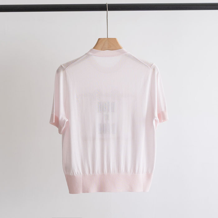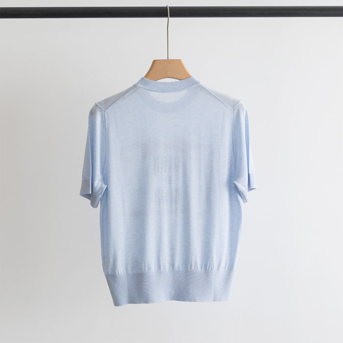 クラシックなクルーネック正肩の半袖ニット T シャツのシルエットを採用。極薄くて通気性に優れたハイグレードアイスニット生地を使用し、襟元、袖口、裾にも同系色のリブで縁取りを施しています。程よくウエストを絞ったレギュラーフィットのカッティングで、体に張り付かず、肩ラインとウエストラインを的確に整えプロポーションを美しく見せてくれます。「ピンクサクラ」「ベビーブルー」の低彩度マカロンカラーを 2 種展開、肌色を選ばず柔らかい雰囲気を演出します。