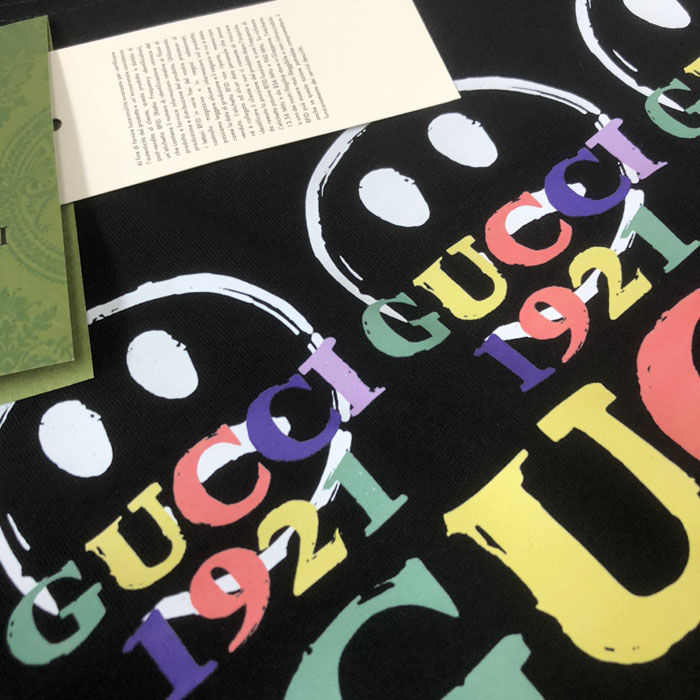 ブラックのベースに、3 つのスマイリー顔と「GUCCI 1921」の文字をレインボーカラーでプリントし、明るくポップな印象を与えます。