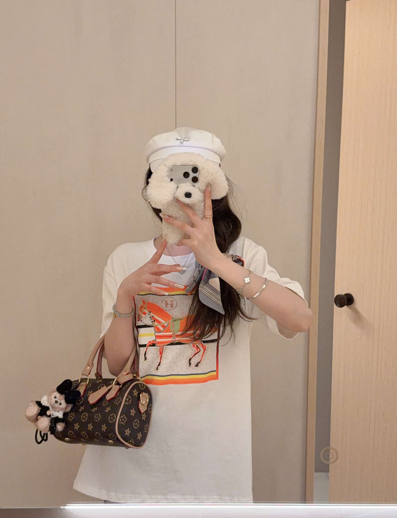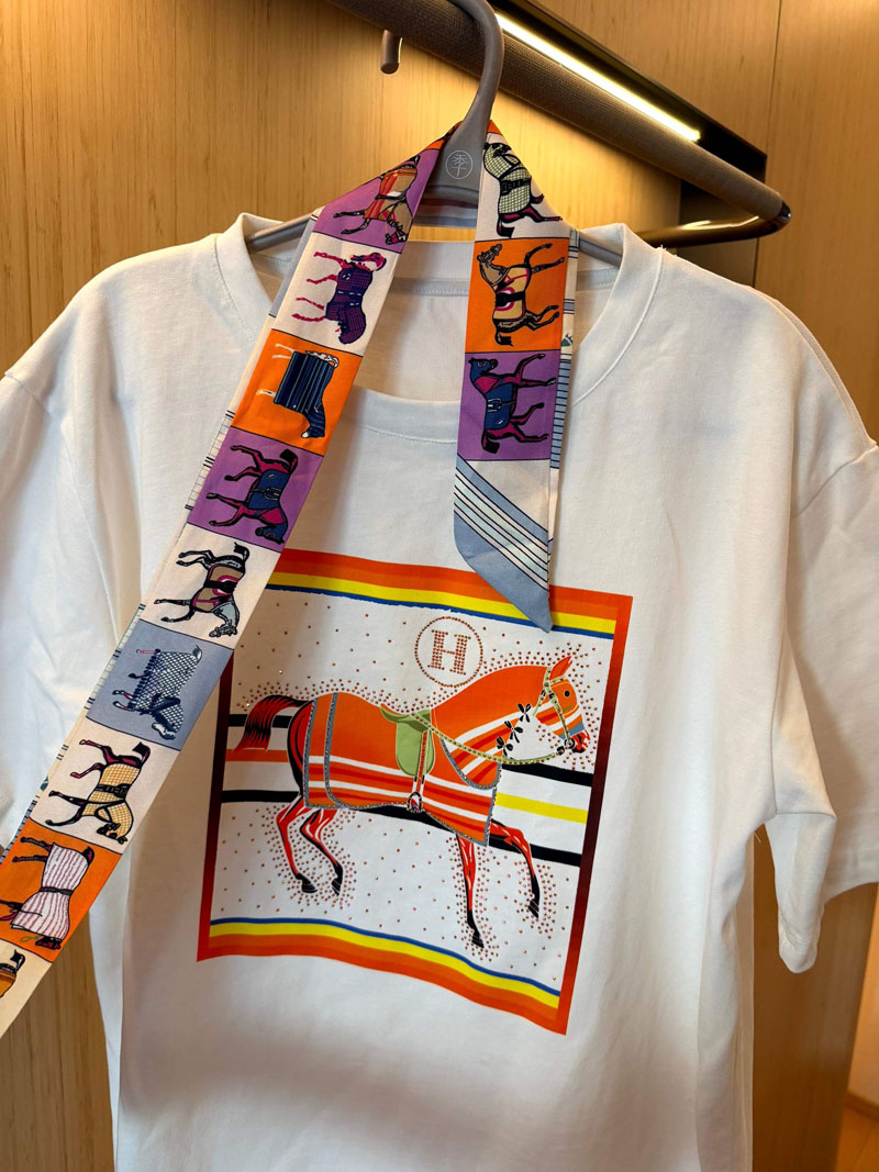 白の清潔感あるコットン素材を使用し、H ロゴと馬柄が華やかなアクセントに。