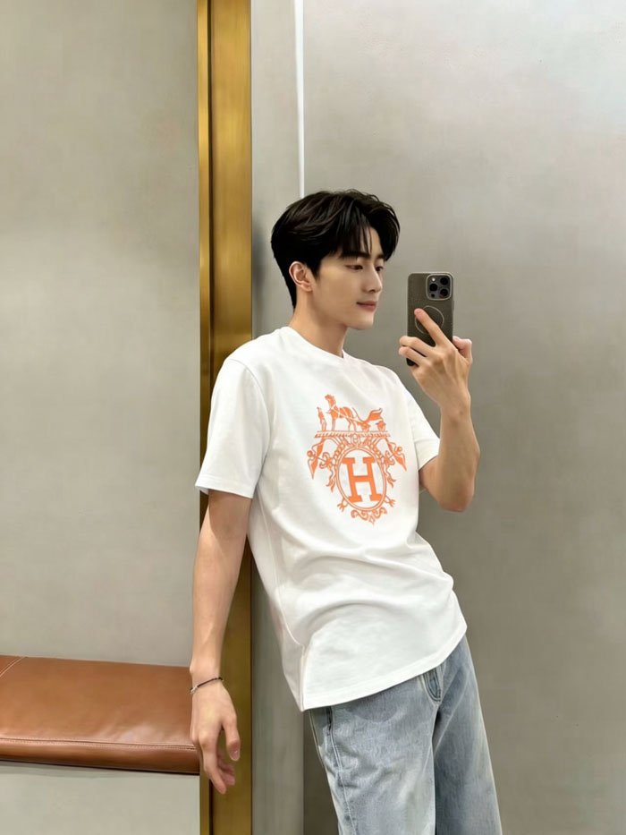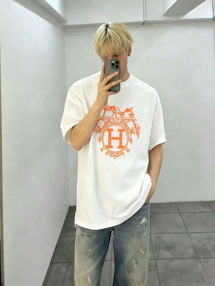エルメス 半袖Tシャツ メンズ 字母 プリント t シャツ クルーネック シルクコットン ブランド HERMES 夏服 極上の肌触り 丸首Tシャツ ブラック ホワイト2色
