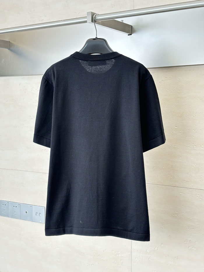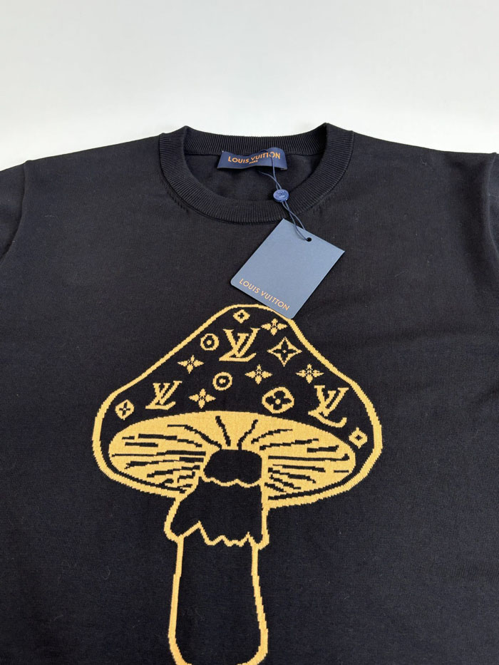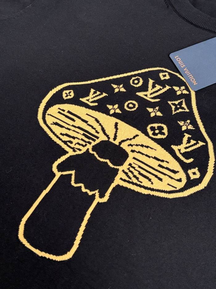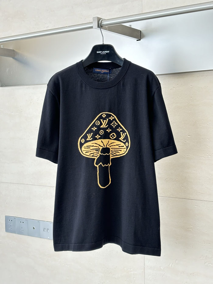 ルイヴィトン 半袖Tシャツ インターシャ きのこ柄 クルーネック コットン100% ブラック メンズ レディース 人気 ブランドTシャツ