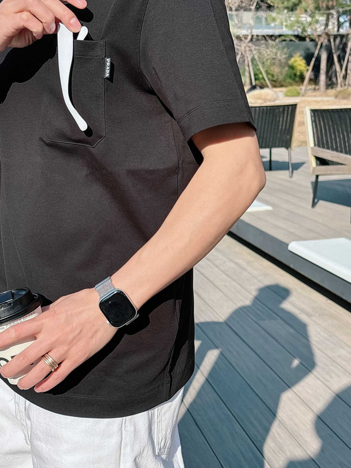 シンプルなブラック無地の上質生地に、胸元ポケットに付いた小さな「PRADA」ロゴタグが高級感を引き立て、大人カジュアルな雰囲気を演出します。
