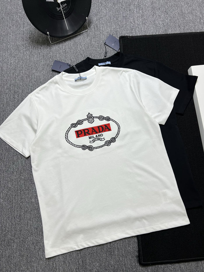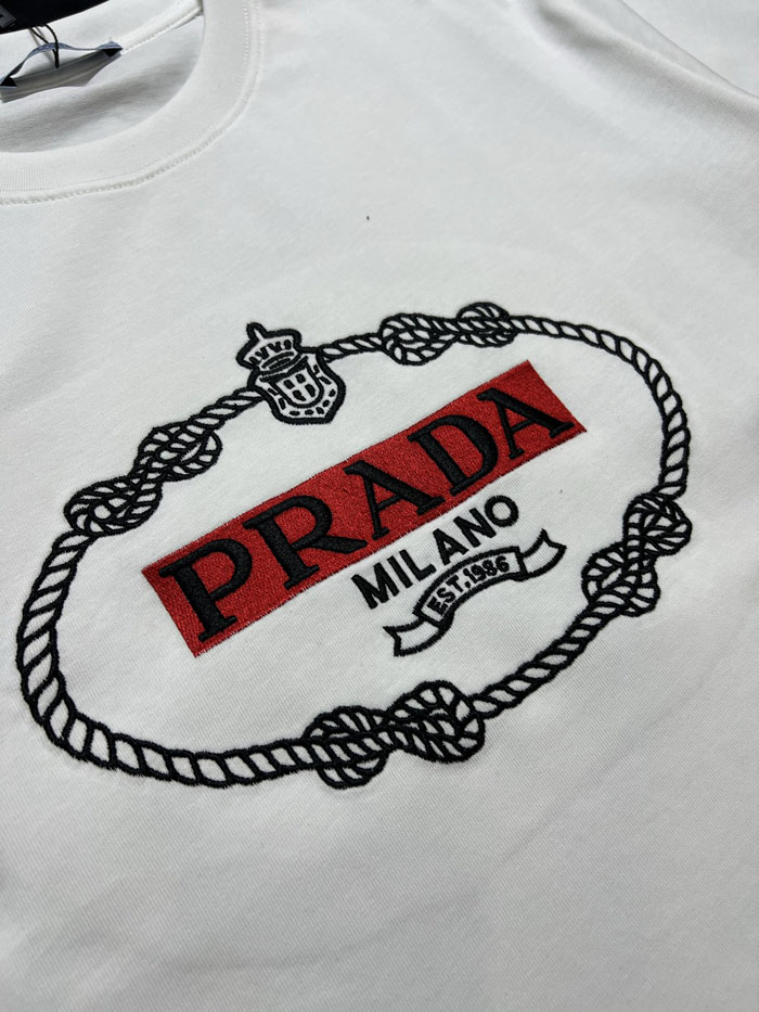 PRADA のアイコニックなロープフレームロゴをプリントした半袖 T シャツです。