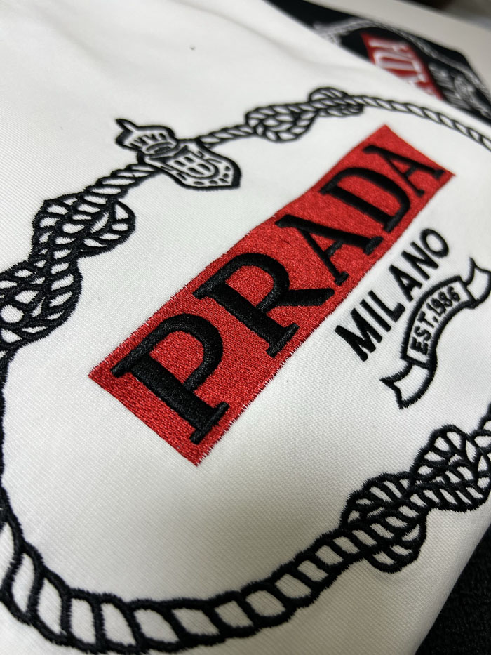 赤い「PRADA MILANO」文字とロープ柄のフレームがブラック・ホワイトのベースに映え、高級感とストリート感を両立したデザインが魅力。